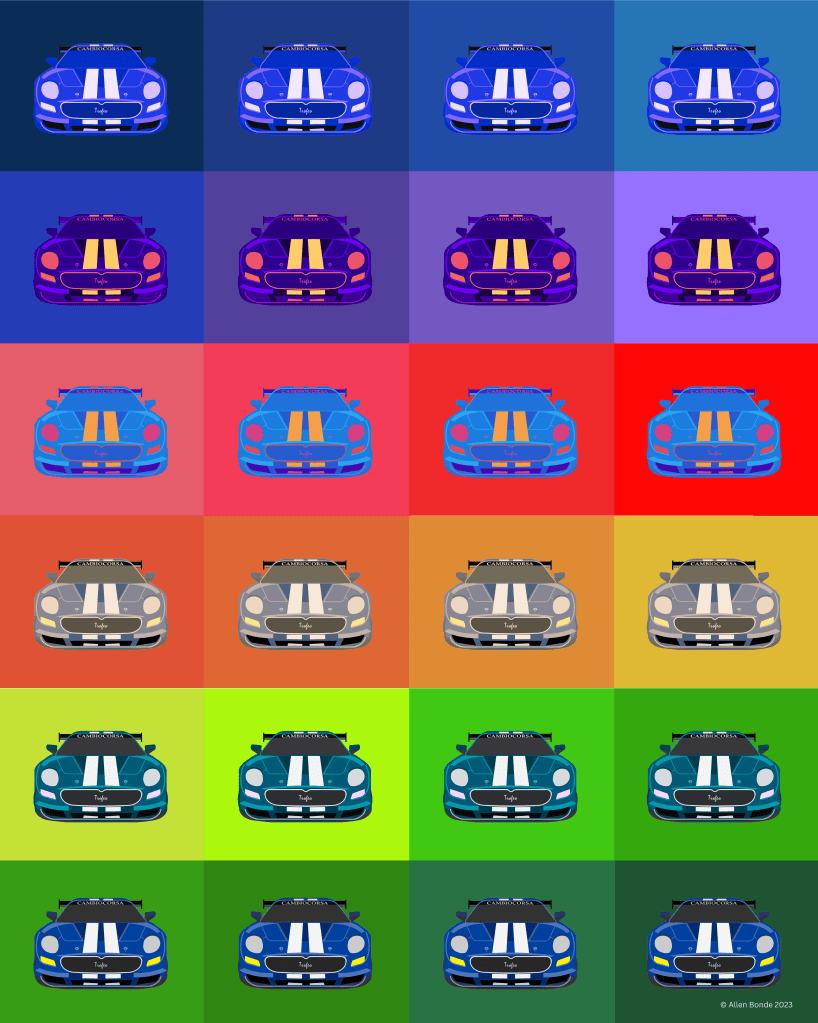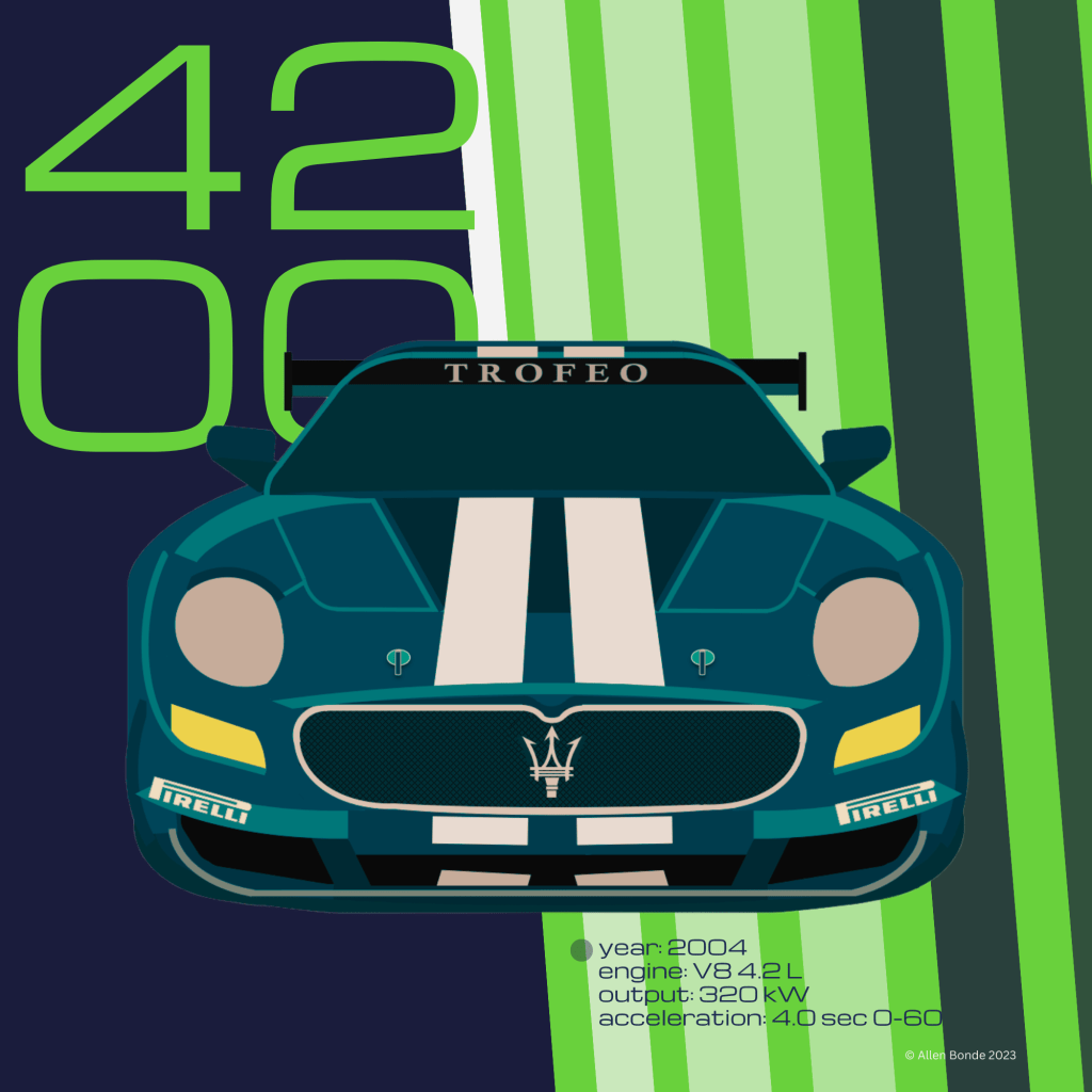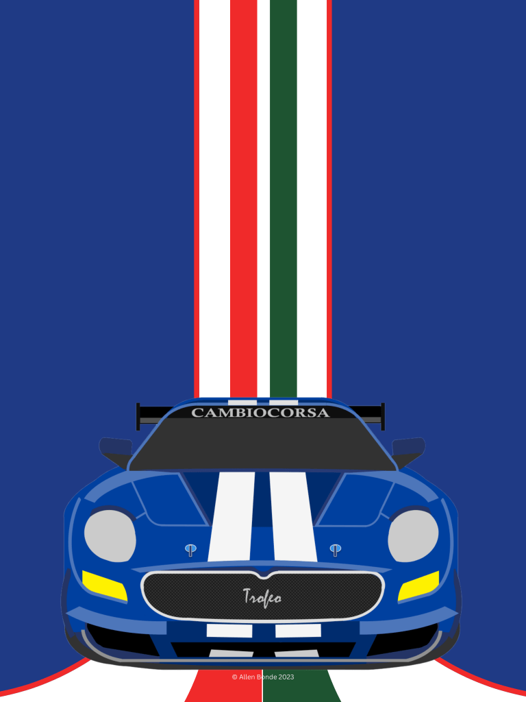 The Giugiaro-penned body looks amazing, especially in the rear three-quarter view. The Ferrari-designed motor provides the thrust. This was a GT that excelled at making a grand exit with the wail of its perfectly tuned quad exhaust. And it was fast – faster than a 911 of this era. After the b/w photo, the top design is a new pop art study now available as a giclee mini-print, while the middle study and bottom original poster celebrates the Trofeo race series which featured this gentleman’s motor.