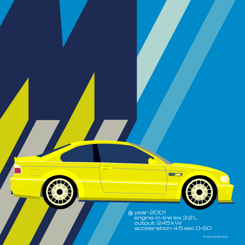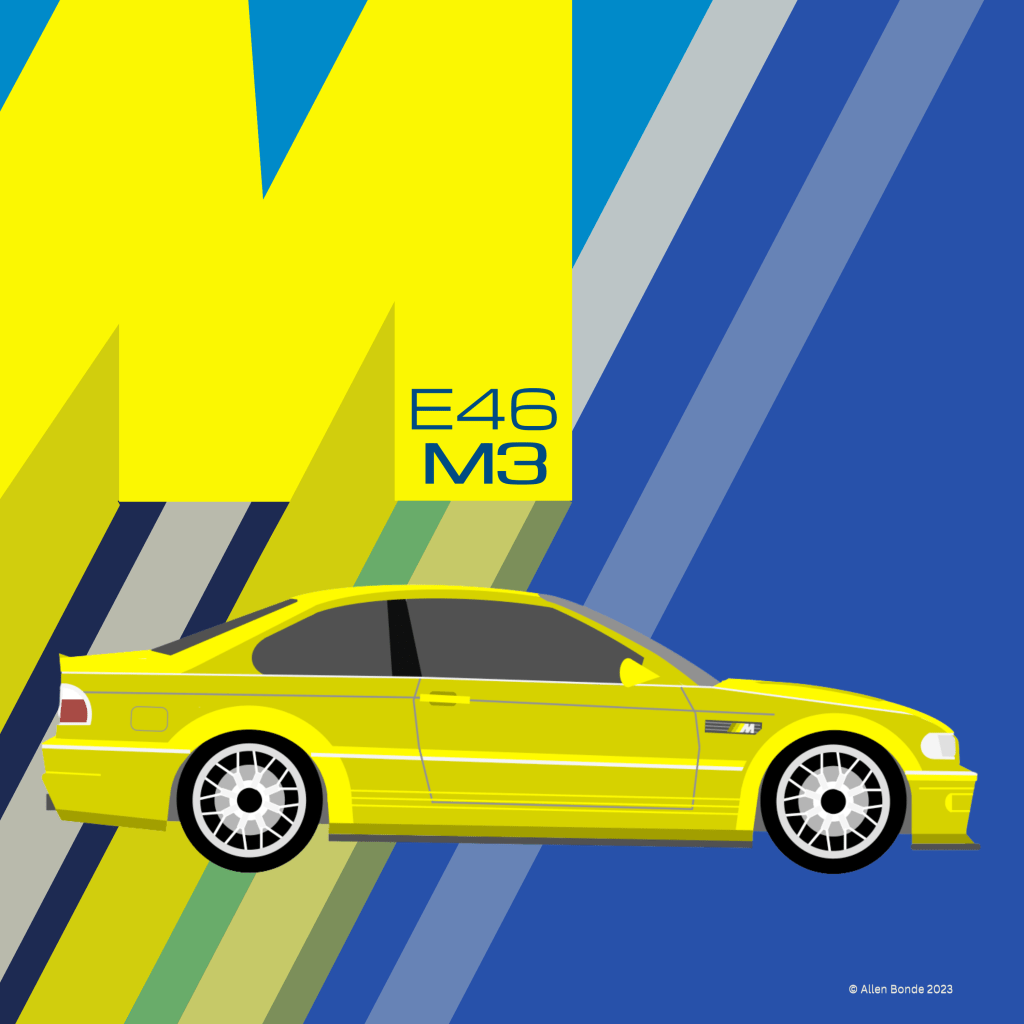 The E46 M3 is a legend. Almost perfect balance, a sublime high-revving motor, and a timeless design. Yes, the SMG-II was clunky, but at speed the E46 was so planted yet responsive. There were some great color choices as well, from classic Titanium Silver, to Laguna Seca Blue, and of course Phoenix Yellow. The middle posters feature this color as a monochrome study and full-color racing-inspired design (now available as a giclee mini-print), while below those is a recent tribute to the mighty ALMS champion M3 GTR.