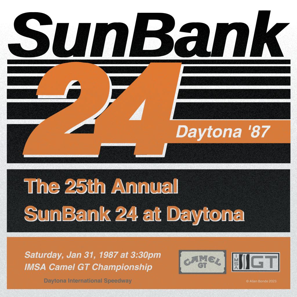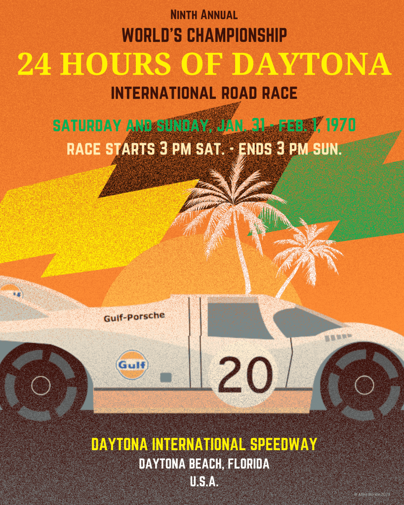 Held for the first time in 1962, the race is run on a 3.56-mile combined road course and takes place the last weekend of January. Unique among endurance racing, the banking makes Daytona stand out – literally if you’ve been outside the gates. These vintage-style posters and bumper sticker (remember those?) celebrate the unique graphical look of the late 80’s and early 70’s, and are inspired by racing photos and copy from souvenir programs from the era.
