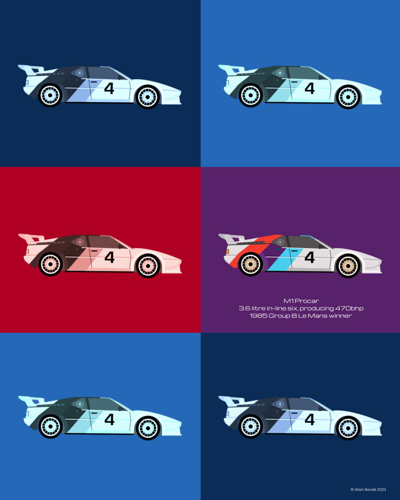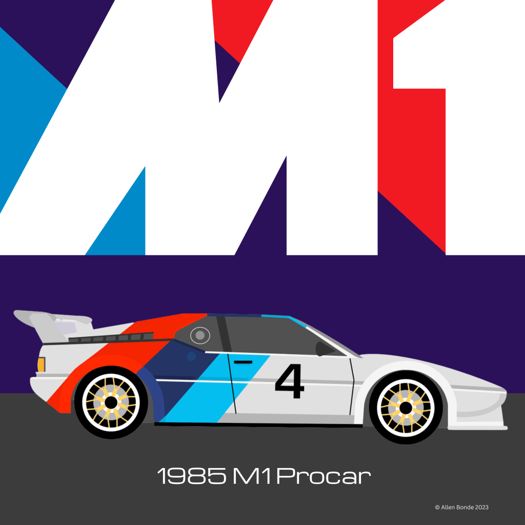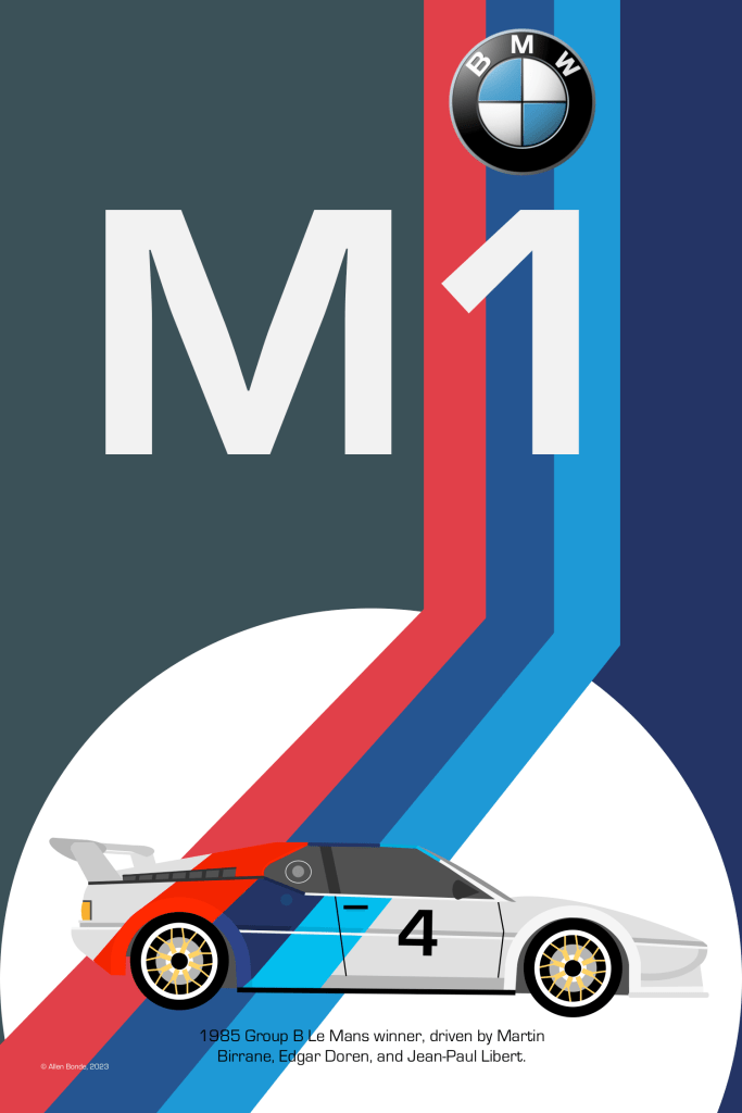 You know a Giugiaro design when you see it. The M1 is one of the best, even though as racers the cars were heavy and had limited success despite the CSL racing engine producing as much as 470 HP. The top design is part of a mini print series, and bottom poster was one of the first designs I made inspired by the Procar livery. It’s all about the stripes!