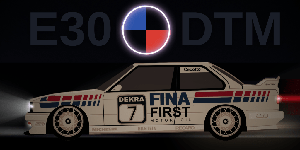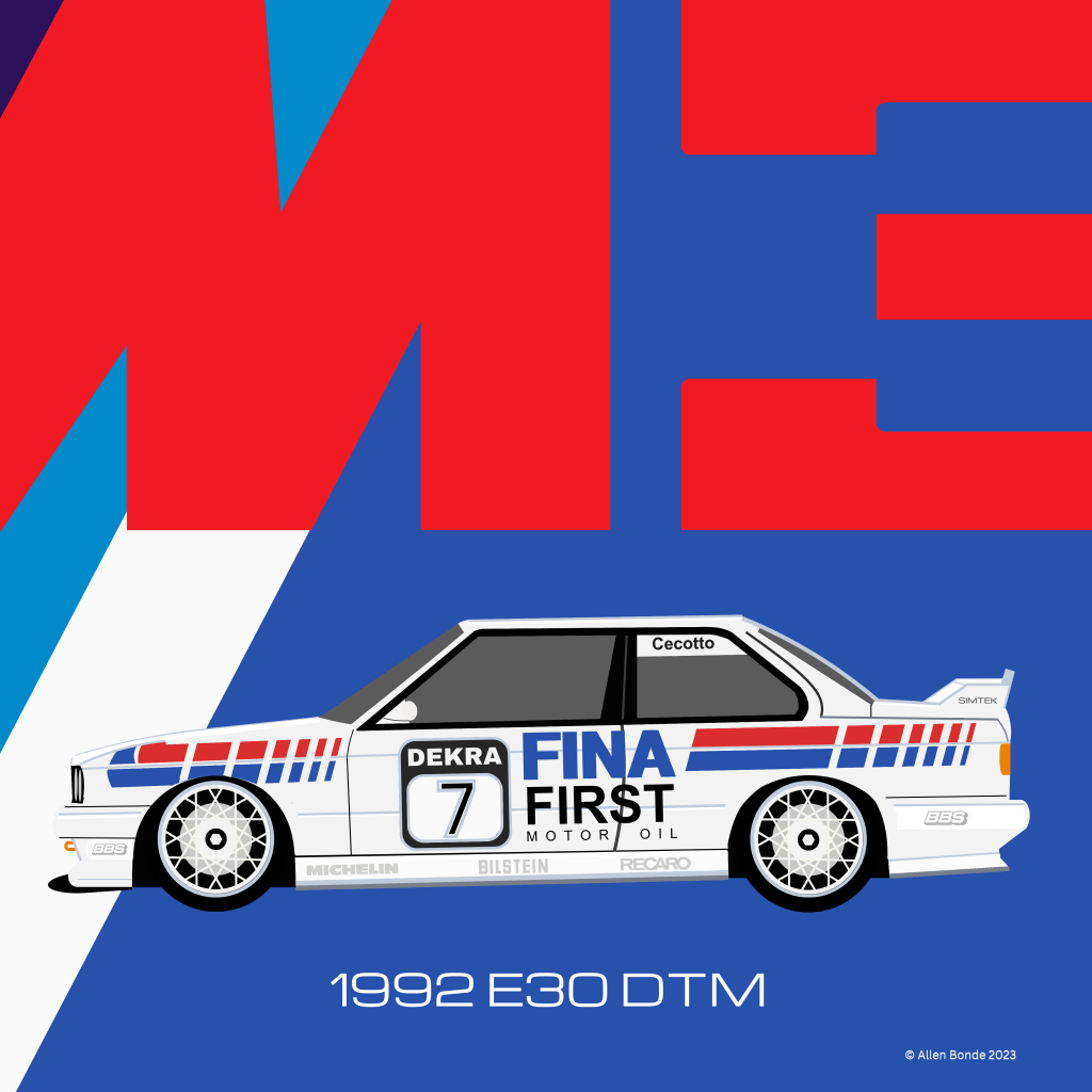 The E30 is timeless in its simple form and lack of high-tech gadgetry. Making 320 HP from its 2.3 L four in DTM (sport evo 2.5) trim, one can argue it’s the most successful BMW racer. It certainly looks great and was super fun to research and draw, especially in the FINA livery recreated in the mini print and poster versions below.