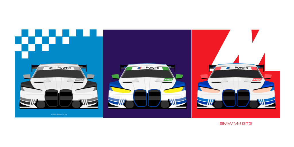 Comparing classic racers of the 1960’s and 70’s shows the quantum leap in technology (and size) of cars as motorsports evolved. Equally fun is reimagining famous liveries and playing with color combos. The first poster below features some famous Porsches – each a Grand Prix winner – in proper scale (yes the 804 and 917 were that small), and the second is another study of the famous Ford GT40 (Chassis 1075). The bottom poster plays with color combos on the modern M4 GT3 race car.