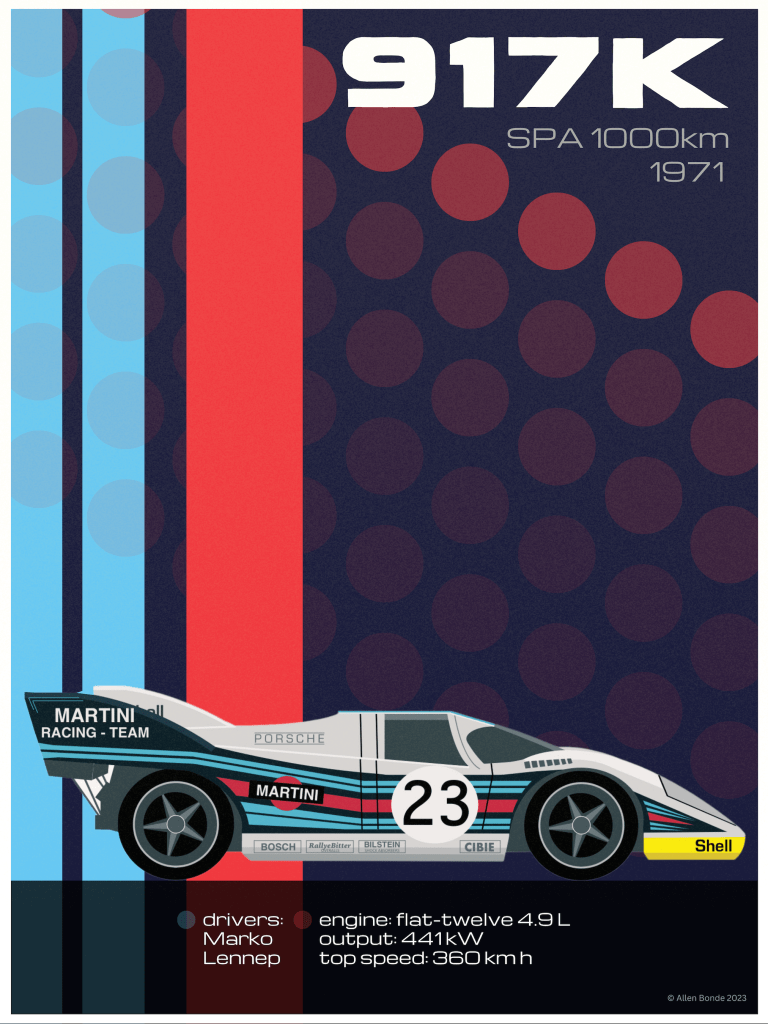 Vintage racing is showtime for the engineers, sponsors, teams, and of course the drivers. These two posters are recent late-night projects that incorporate some previous car designs into tributes to period race posters. The first, celebrating the 917K that looked great while getting a DNF at the 1971 race at SPA. And the second re-imagines the period poster celebrating the French Grand Prix winning Type 804 race car (until recently Porsche’s only F1 entry).
