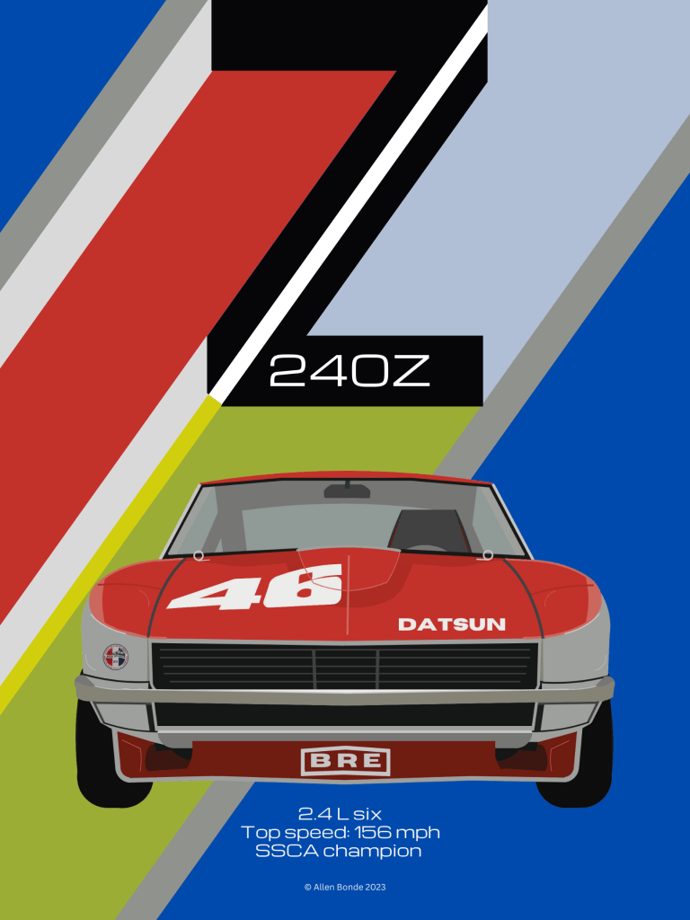 An original JDM legend launched as the Fairlady Z in late 1969, the Brock Racing Enterprises (BRE) 240Z became an “instant” classic in 1970-1971. Running in the SSCA C production category, a season of firsts ended with a championship at Road Atlanta, and dominance through BRE’s run with Datsun through 1973. The studies below include several tributes to the number 46 240Z, starting with the iconic Datsun racing stripes, then a pop art poster with various color combos on the 1971 racer, and finally a racing style poster featuring the SSCA winner and “Z” treatment from original Japanese adverts. All of these will be available as custom order prints in 2024.