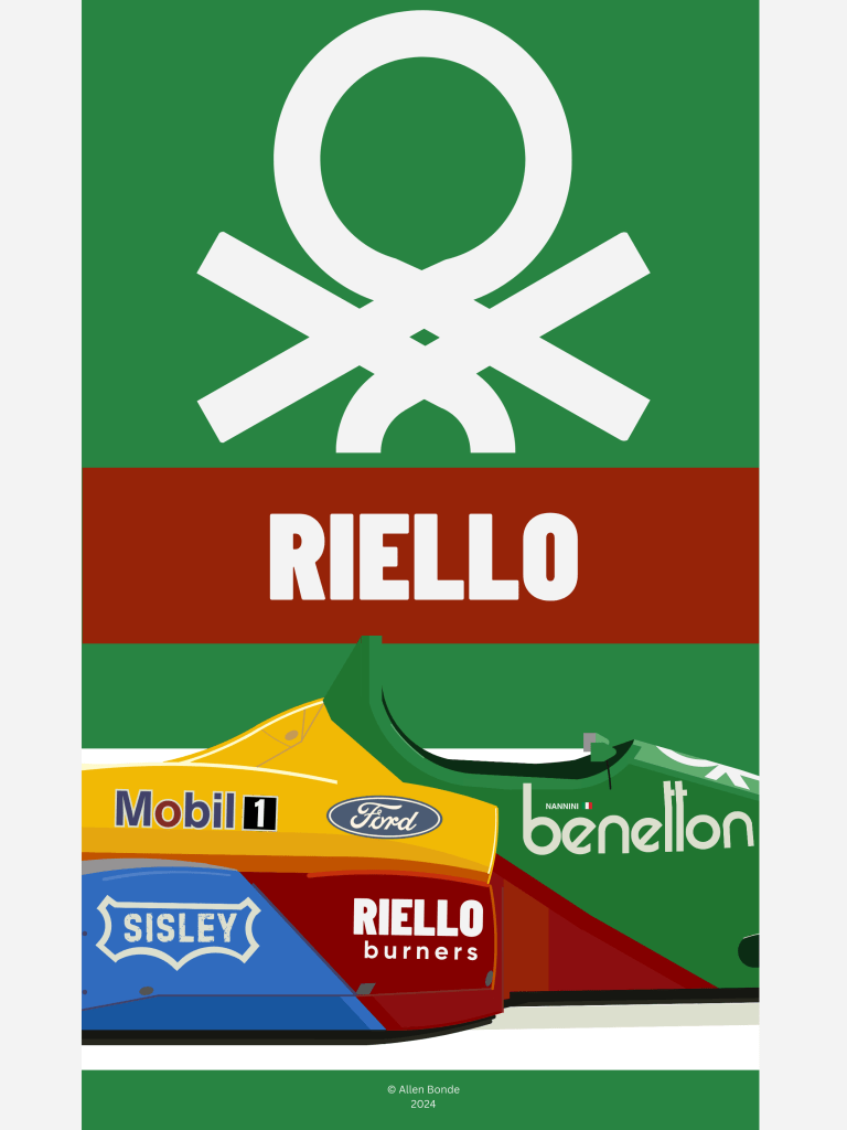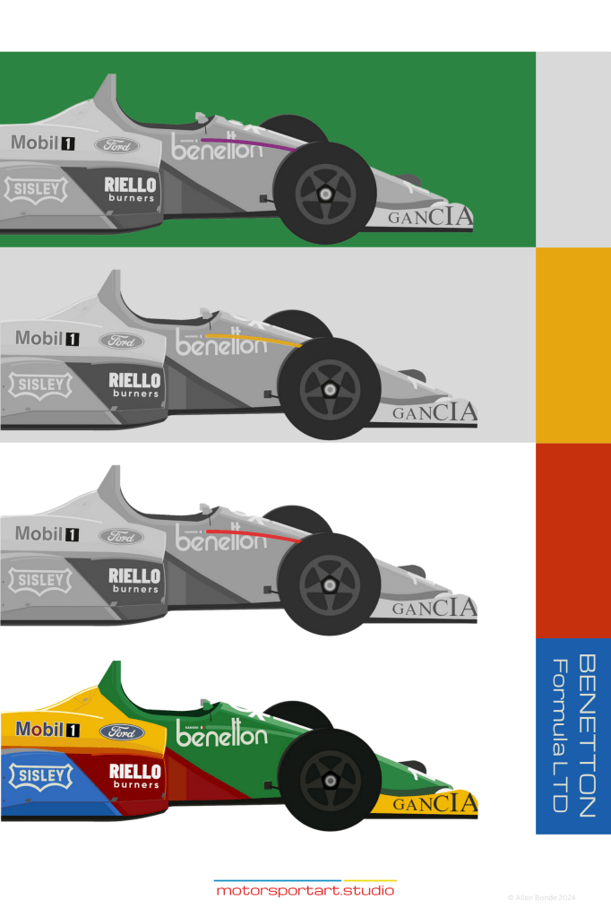 A classic 1980s livery if there ever was one! Here is the bold Benetton Formula LTD B188, raced in Formula One for 1988 and part of 1989. Powered by a naturally aspirated Ford V8, Benetton finished 3rd in the Constructors’ Championship. Super fun to draw, and certainly one of the most unique and recognizable color schemes in open-wheel racing. The first design study, “F1 Colors” is available as a fine art print from our gallery partner, Colors of Chatham.