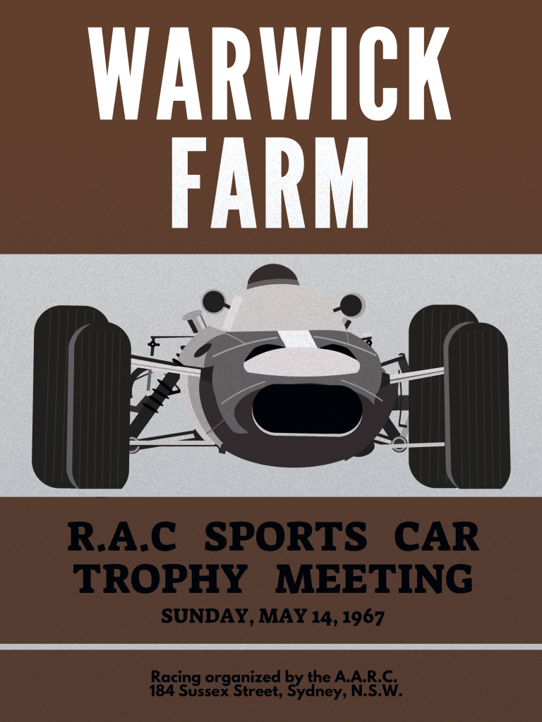 From the Supercars series to F1, Australia has a rich motorsport history. One of the more colorful circuits was Warwick Farm in Sydney, a horseracing course which hosted motor racing from 1960-1974, including the Australian Grand Prix in 1963, 1967 and 1971. These tribute posters, drawn from vintage programs and descriptions, celebrate three of the races held at this unique circuit.